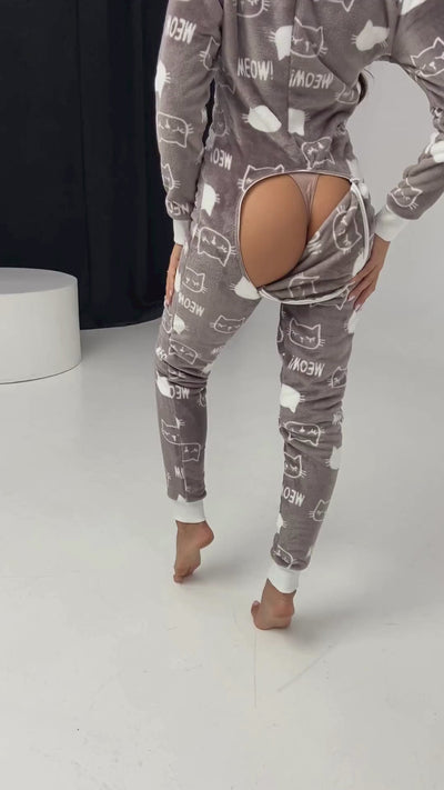 Women's cozy terry butt flap pajamas Sweetjama Frozy with a hood "Meow"