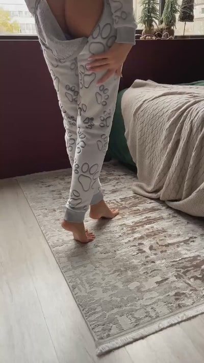 Women's warm terry butt flap pajamas Sweetjama Frozy with a hood "Gray Paws"