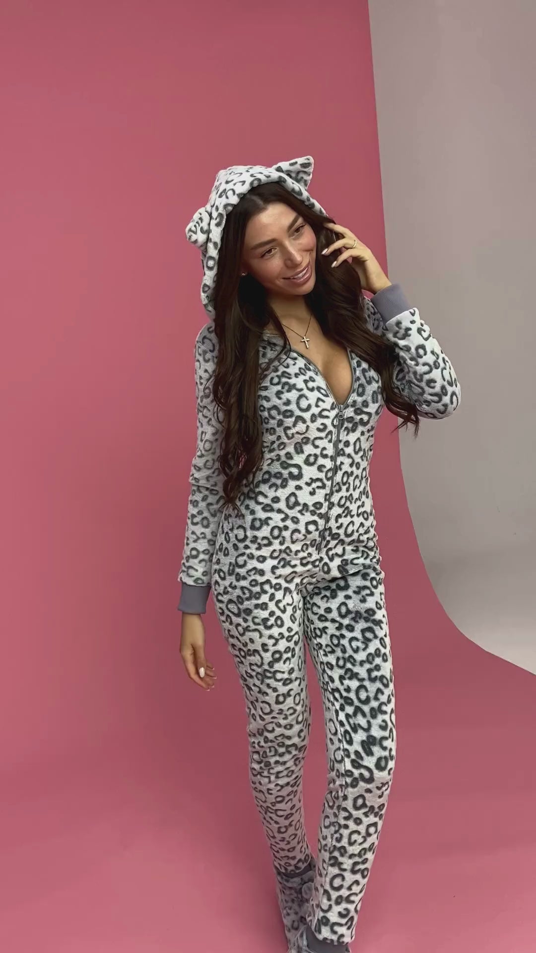Women's warm terry butt flap pajamas Sweetjama Frozy with a hood "Leopard"